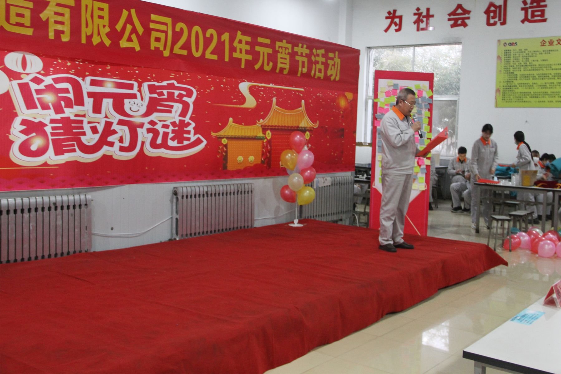 為弘揚中國傳統(tǒng)元宵節(jié)文化,豐富全體員工文娛生活,營造新春佳節(jié)喜慶、祥和的節(jié)日氛圍,增強(qiáng)員工團(tuán)結(jié)、向上、積極的工作精神,促進(jìn)生產(chǎn)經(jīng)營工作良好發(fā)展。2月25日晚17:20,由公司團(tuán)委牽頭組織的2021年度“猜燈謎、慶元宵”聯(lián)歡晚會在員工餐廳隆重舉行。