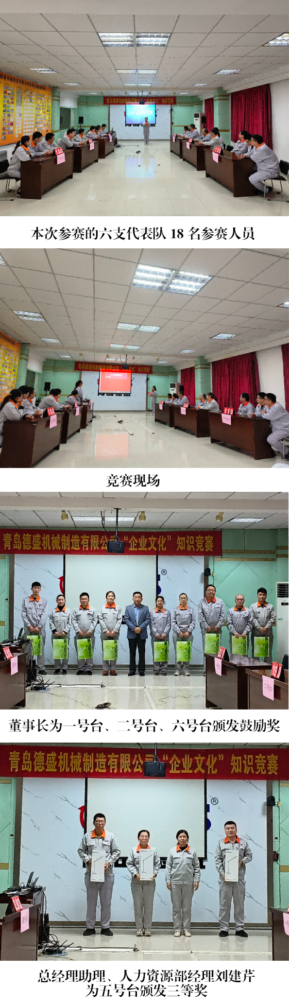 本次知識競賽由個人必答題、小組搶答題、風險題、附加題和觀 眾題五個環(huán)節(jié)組成,競賽內容涉及公司企業(yè)文化、安全生產、員工須 知、管理制度和6S 管理。本次競賽公司各個部門都積極參與,最終 選定 18 名代表參加競賽。18 名代表賽前做了充分準備,比賽過程中, 各代表隊都以飽滿的熱情和嫻熟的作答充分展示著自己的學習成果。隊員們用標準的答案、流暢的語言和不凡的表現(xiàn)不斷贏得陣陣喝彩。相互鼓勵、默契配合的團隊精神無時無刻地感染著現(xiàn)場的觀眾。經過 激烈的比賽,最終四號臺獲得一等獎,三號臺獲得二等獎,五號臺獲 得三等獎,其他三支隊伍獲得鼓勵獎。